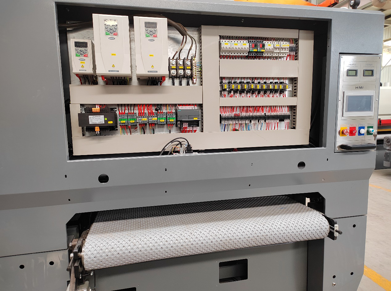 采用易能ENA100系列變頻器,控制砂帶旋轉(zhuǎn)速度和送料速度的自動(dòng)化砂光機(jī),可實(shí)現(xiàn)無(wú)級(jí)變速,降低人力需求、增進(jìn)產(chǎn)能。送料電機(jī)配有一個(gè)編碼器用于計(jì)算加工量及工件位置。砂架、砂頭的數(shù)量可根據(jù)實(shí)際需求增減,由PLC程序控制多臺(tái)變頻器驅(qū)動(dòng)砂帶電機(jī)運(yùn)行,通過(guò)無(wú)極調(diào)速功能,滿足各種材質(zhì)的加工需求。砂光機(jī)設(shè)備可根據(jù)加工量增加而啟動(dòng)氣閥,進(jìn)行自動(dòng)進(jìn)給補(bǔ)償,保證砂頭不會(huì)因磨輪的磨損而改變砂削效果,保證成品的規(guī)格統(tǒng)一。